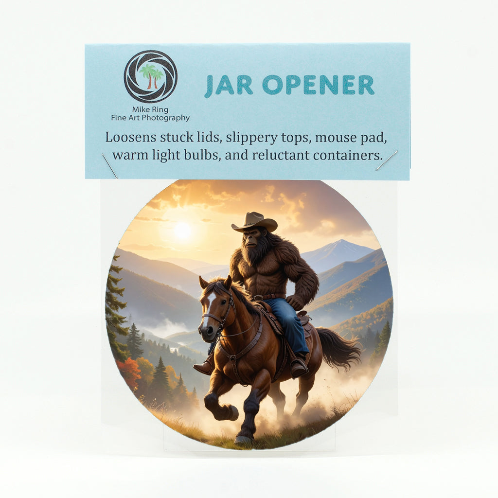 JAR OPENERThis jar opener loosens stuck lids, slippery tops, warm light bulbs and reluctant containers. This would also make a cute mini mousepad for a computer. Another good idea is to use it as a coaster. The top surface is a polyester with an open cell tan rubber backing. The jar opener is packaged in a clear bag with a top information card for hanging.  Size: 5” x .06”