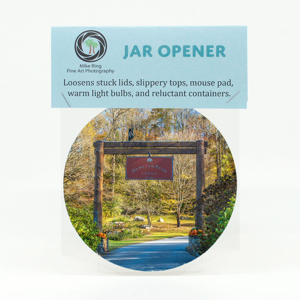 JAR OPENER - This jar opener loosens stuck lids, slippery tops, warm light bulbs and reluctant containers. This would also make a cute mini mousepad for a computer. Another good idea is to use it as a coaster. The top surface is a polyester with an open cell tan rubber backing. The jar opener is packaged in a clear bag with a top information card for hanging. Size: 5” x .06”