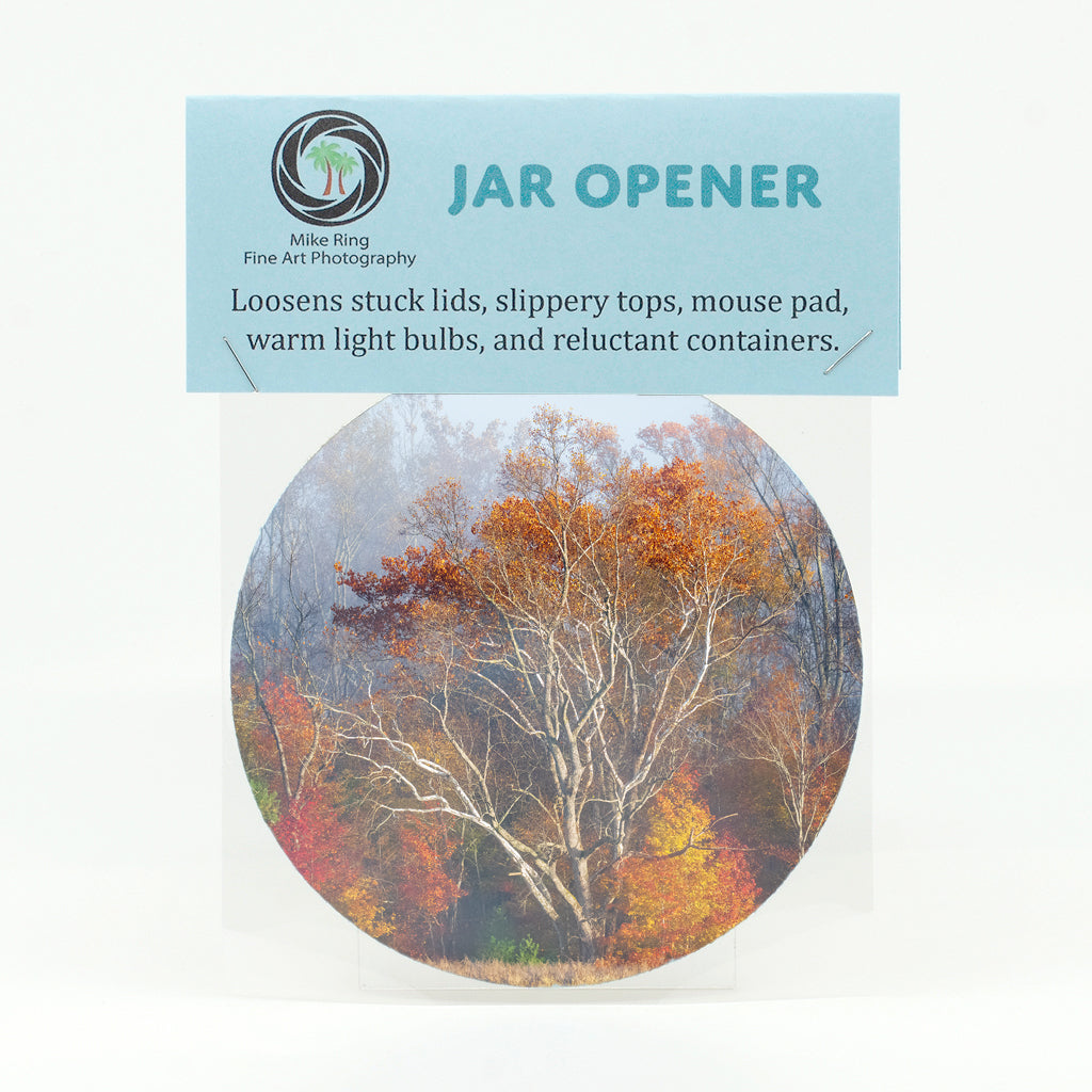 JAR OPENER - This jar opener loosens stuck lids, slippery tops, warm light bulbs and reluctant containers. This would also make a cute mini mousepad for a computer. Another good idea is to use it as a coaster. The top surface is a polyester with an open cell tan rubber backing. The jar opener is packaged in a clear bag with a top information card for hanging. Size: 5” x .06”